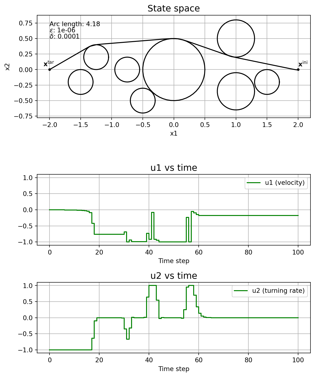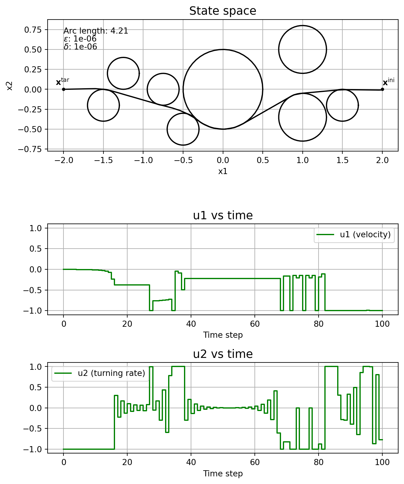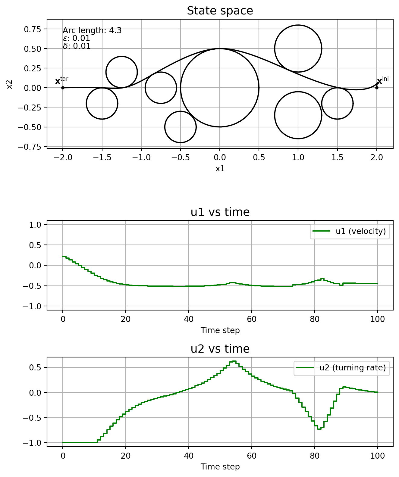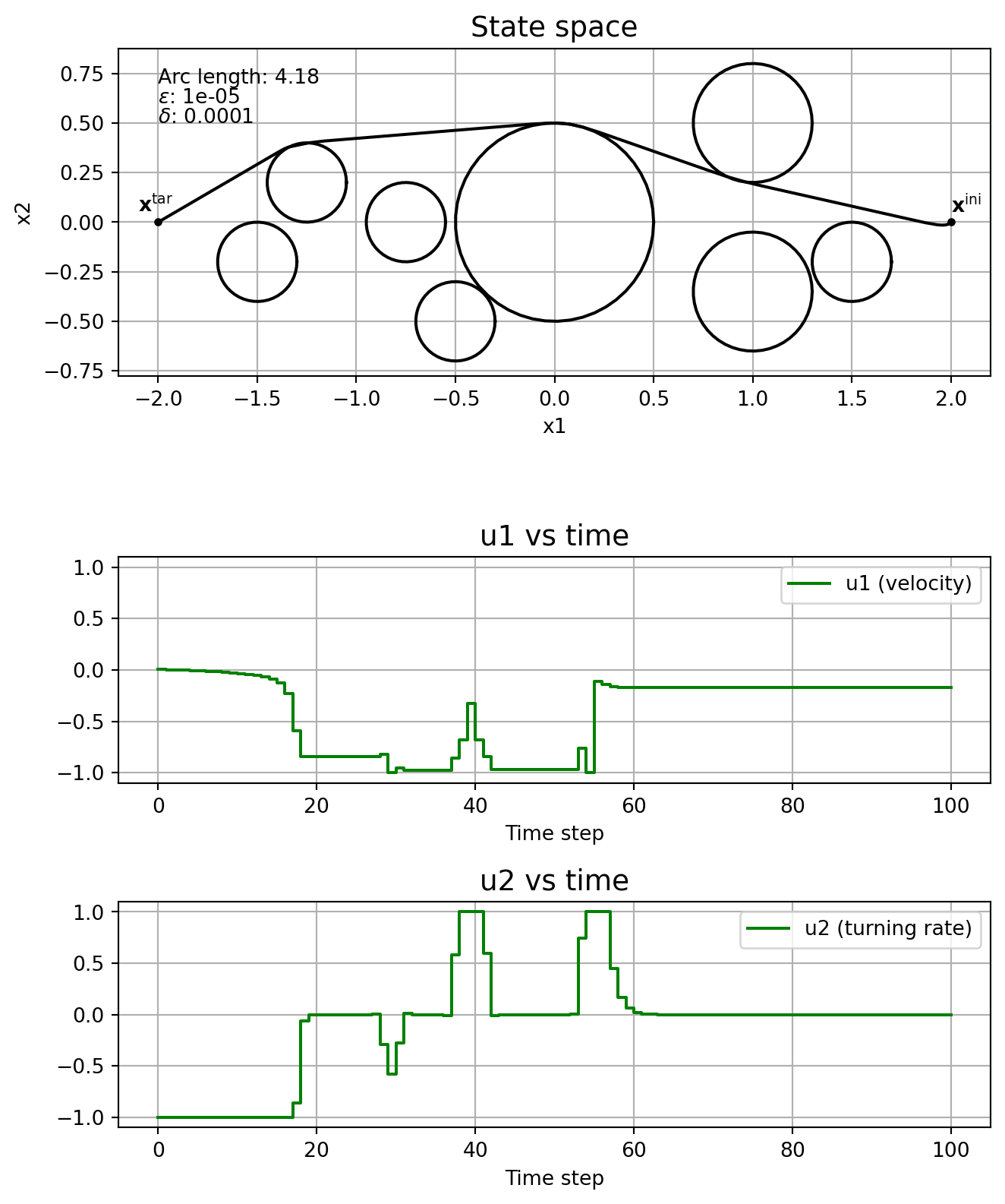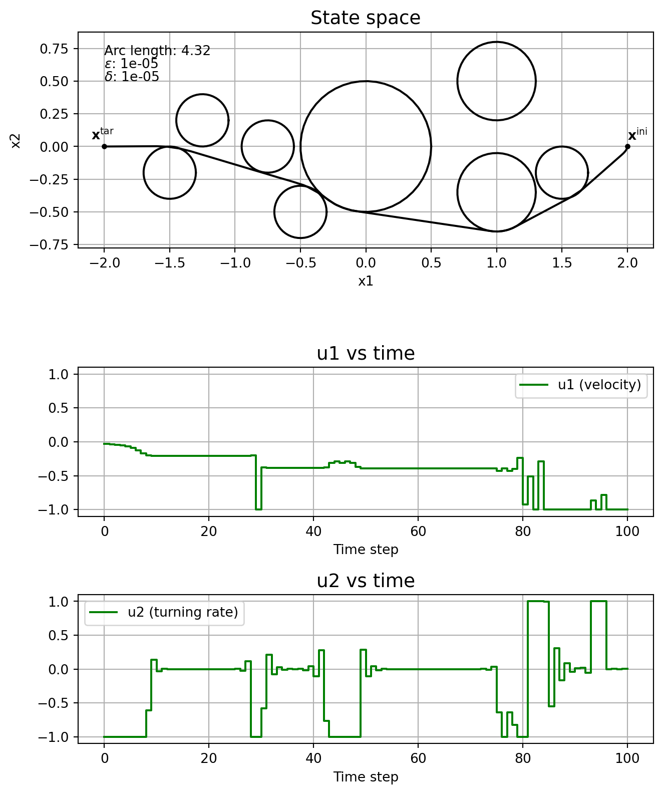 \] where \(T\geq 0\) is the finite time horizon, \(J:\mathrm{C}_T^3\times\mathrm{PC}_T^2\rightarrow \mathbb{R}_{\geq 0}\) is the cost functional, \(\mathbf{x}^{\mathrm{ini}} \in\mathbb{R}^3\) is the initial state and \(\mathbf{x}^{\mathrm{tar}}\in\mathbb{R}^3\) is the target state. The control is constrained to \(\mathbb{U}:= [\underline{u}_1, \overline{u}_1]\times [\underline{u}_2, \overline{u}_2]\), with \(\underline{u}_j < 0 <\overline{u}_j\), \(j=1,2\). Circular obstacles are given by a centre, \((c_1^i, c_2^i)\in\mathbb{R}^2\), and a radius, \(r_i\in\mathbb{R}_{\geq 0}\), with \(\mathbb{I}\) indicating the indices of all obstacles. For the cost functional we’ll consider the arc length of the curve connecting \(\mathbf{x}^{\mathrm{ini}}\) and \(\mathbf{x}^{\mathrm{tar}}\), that is, \[