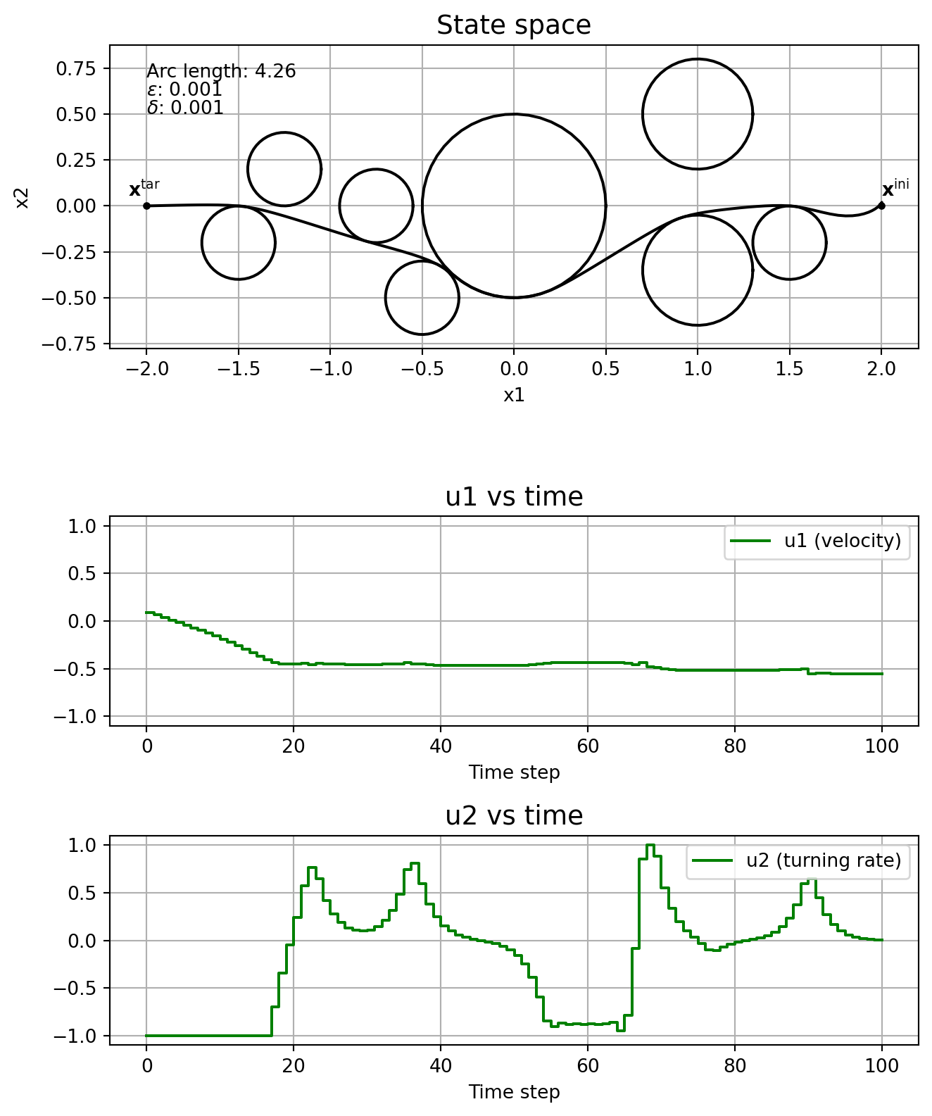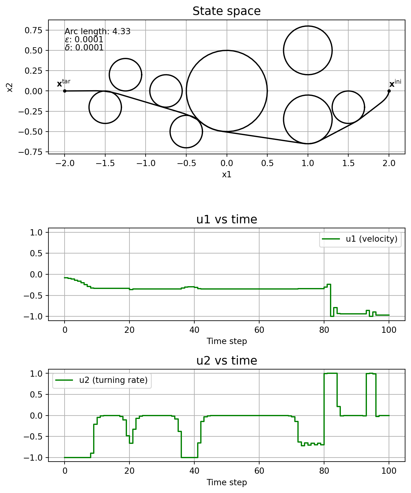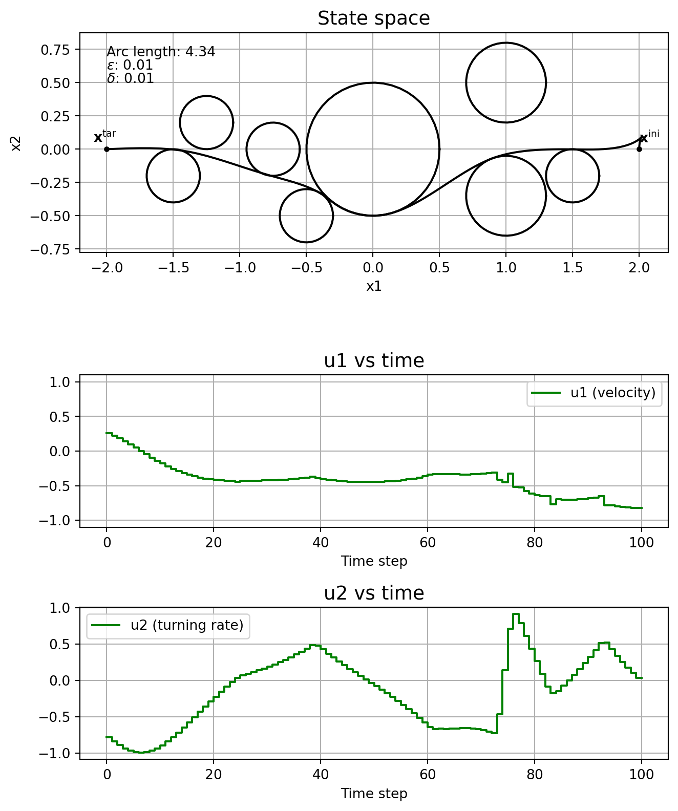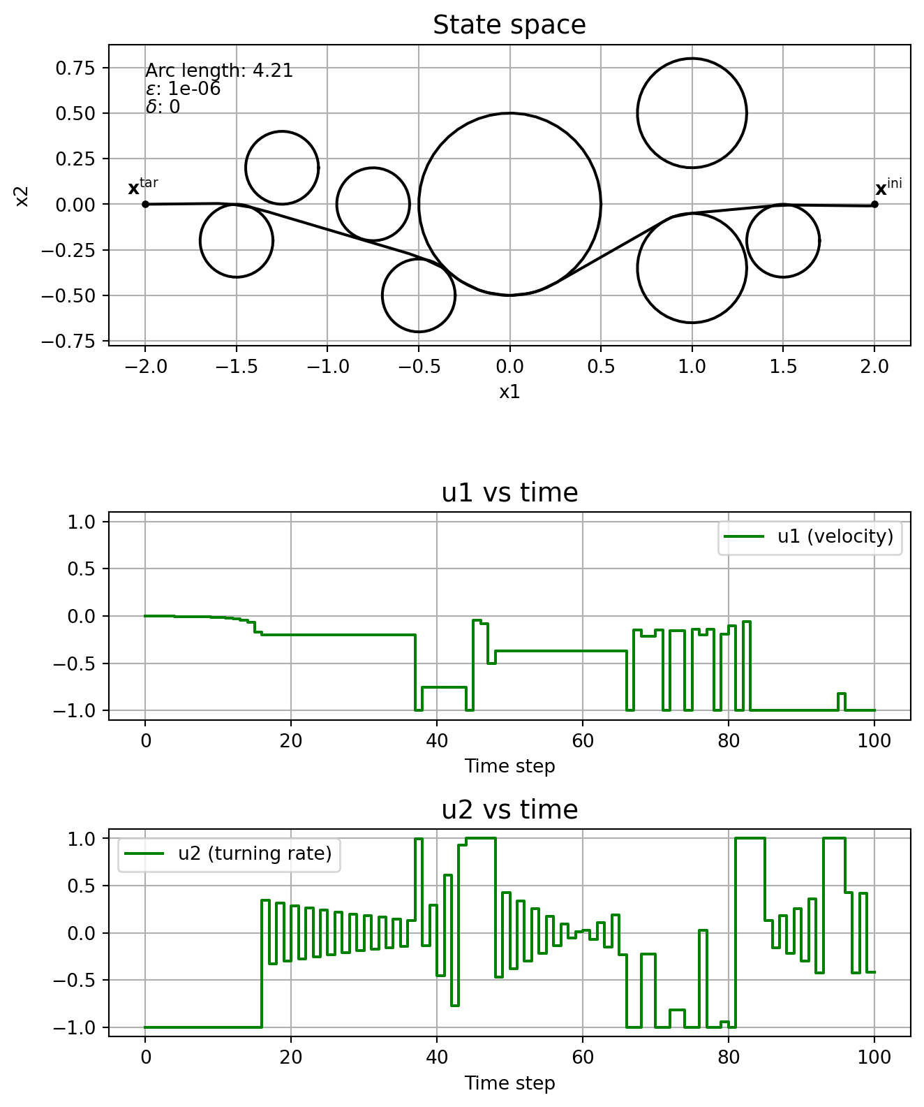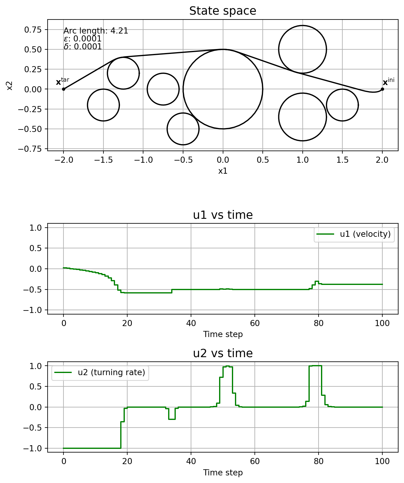 \] where \(T\geq 0\) is the finite time horizon, \(J:\mathrm{C}_T^3\times\mathrm{PC}_T^2\rightarrow \mathbb{R}_{\geq 0}\) is the cost functional, \(\mathbf{x}^{\mathrm{ini}} \in\mathbb{R}^3\) is the initial state and \(\mathbf{x}^{\mathrm{tar}}\in\mathbb{R}^3\) is the target state. The control is constrained to \(\mathbb{U}:= [\underline{u}_1, \overline{u}_1]\times [\underline{u}_2, \overline{u}_2]\), with \(\underline{u}_j < 0 <\overline{u}_j\), \(j=1,2\). Circular obstacles are given by a centre, \((c_1^i, c_2^i)\in\mathbb{R}^2\), and a radius, \(r_i\in\mathbb{R}_{\geq 0}\), with \(\mathbb{I}\) indicating the indices of all obstacles. For the cost functional we’ll consider the arc length of the curve connecting \(\mathbf{x}^{\mathrm{ini}}\) and \(\mathbf{x}^{\mathrm{tar}}\), that is, \[