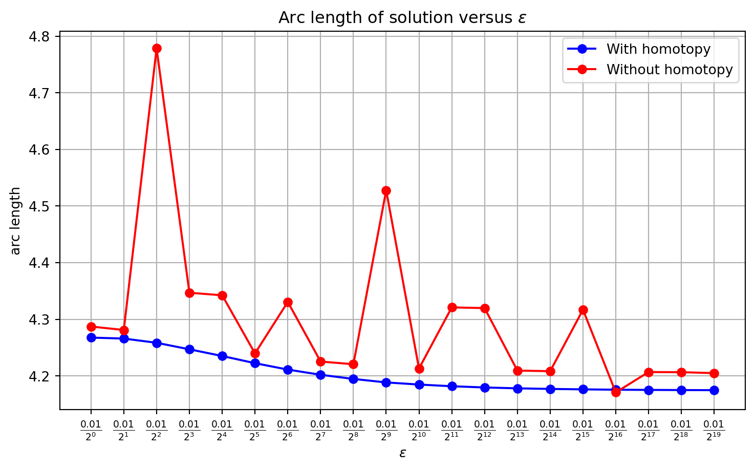 As one would expect, the arc length of the solution obtained via the homotopy algorithm monotonically decreases with increasing \(i\). Here, \(\delta\)=1e-4 throughout.