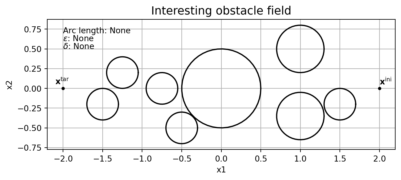 In this section we’ll consider \(\mathrm{NLP}_{\varepsilon, \delta}\) with initial and target states \(\mathbf{x}^{\mathrm{ini}} = (2,0,\frac{\pi}{2})\) and \(\mathbf{x}^{\mathrm{tar}} = (-2,0,\mathrm{free})\), respectively (thus \(L = 4\)). We’ll take the horizon as \(T=10\) and keep the discretisation step size in the RK4 scheme constant at \(h=0.1\), thus \(K=100\). As the control constraints we’ll take \(\mathbb{U} = [-1,1] \times [-1, 1]\), and we’ll consider this interesting obstacle field: